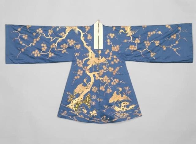 △以金線和孔雀羽毛繡成的戲服“藍色緞平金繡整枝松鶴紋老旦帔”
