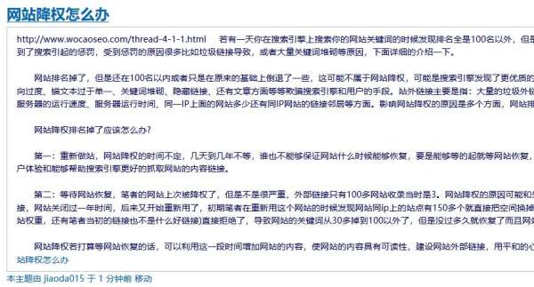 這是我在搜索“網(wǎng)站降權(quán)了怎么辦”中發(fā)現(xiàn)到的一個(gè)頁面,我關(guān)注的是網(wǎng)站降權(quán)了怎么辦,但是頁面給我的的是:1、重新做網(wǎng)站;2等待恢復(fù)!正常搞網(wǎng)站的人都知道,這2個(gè)答案真是瞎扯了。我重新做網(wǎng)站,還用你說?而且重新做網(wǎng)站重新優(yōu)化的代價(jià)有多大?再有就是等待網(wǎng)站恢復(fù)?問題不解決,網(wǎng)站權(quán)重怎么恢復(fù)?