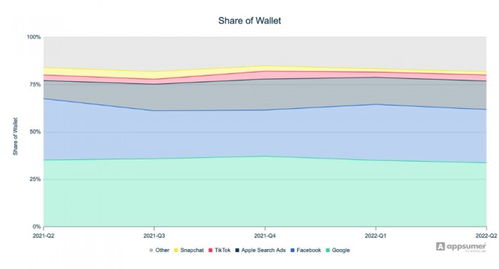 "這種趨勢也體現(xiàn)在錢包份額上,ASA的份額同比增長了5個百分點,達到了15%,"Appsumer報告繼續(xù)說道。"Meta同比下降了四個百分點,但仍以28%的份額大幅領(lǐng)先。"