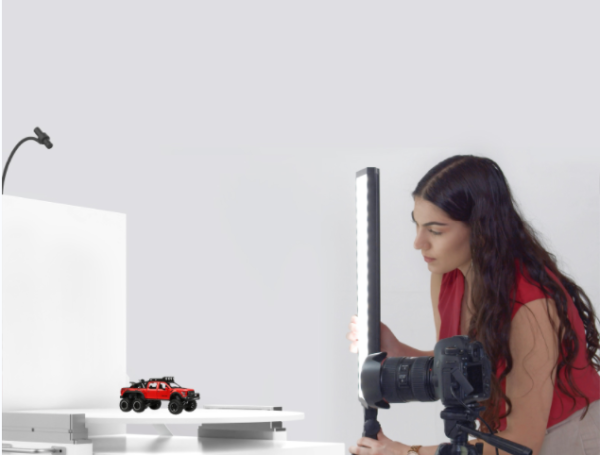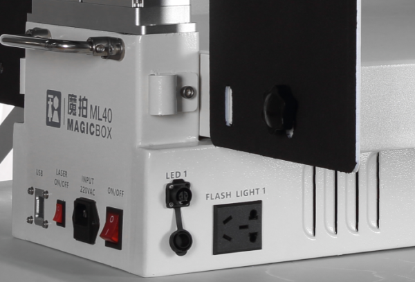 基于此,ML40以白色背景板+白色底盤的“L”造型呈現,并且白色背景板上方配有十字激光定位器,白色背景板+白色底盤在拍攝過程中便于呈現干凈無陰影,方便后期圖片快速處理;而十字激光定位器則起到精準定位效果,幫助拍攝者輕松搞定產品居中放置的效果。